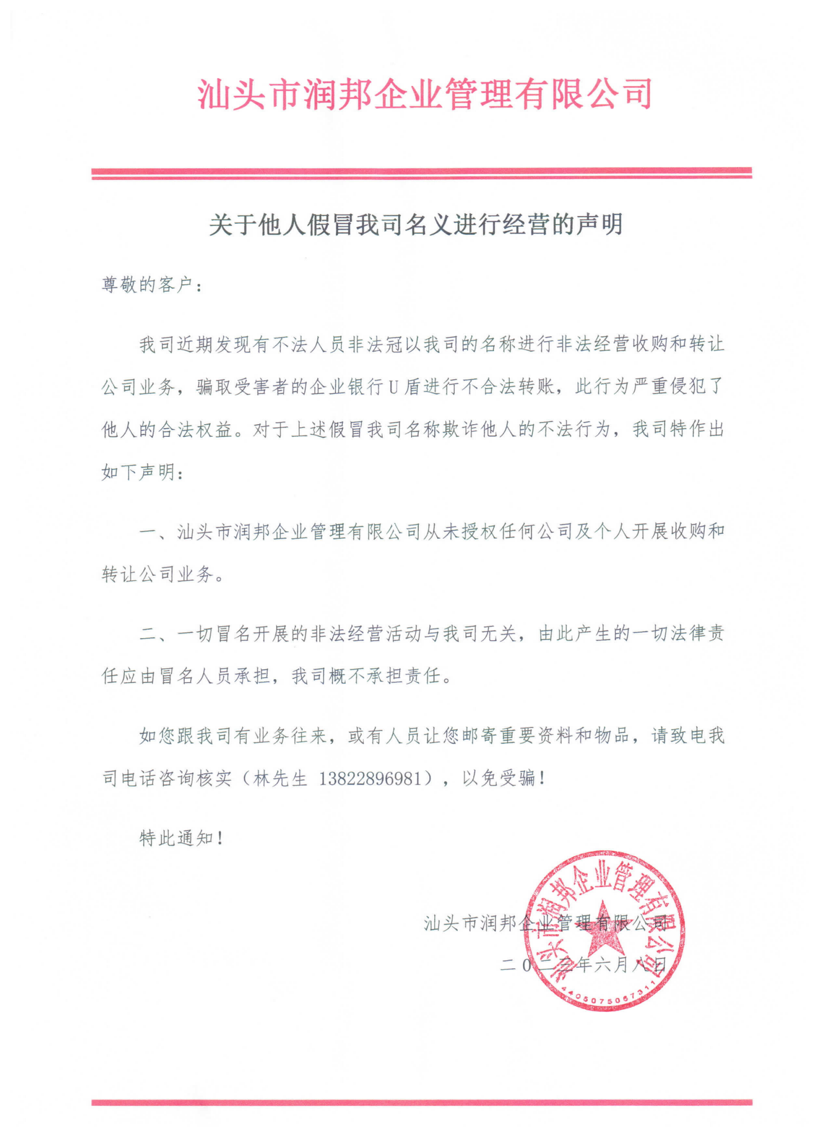 關(guān)于近期有陌生來電反映有不法分子冒用我司名義對他人采取高價收購公司,騙取企業(yè)主對公賬戶U 盾一事做出聲明。